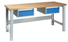 Dielenský stôl s dvoma 1-zásuvkovými kontajnermi. Rozmery d x š x v = 2000 x 700 x 840 mm. Zásuvka na teleskopických gulôčkových výsuvoch, nosnosť 50 kg. Nosnosť stola 500 kg pri rovnomerne rozloženom zaťažení. Pevné podnožie zvarené z ocelových profilov hr. 3,3 mm. Pracovná plocha z kvalitnej bukovej škárovky hr. 40 mm (bez povrchovej úpravy) alebo z bukovej preglejky hr. 40 mm, (horná plocha ošetrená ľanovou fermežou) - požadovanú variantu pracovnej dosky vyberte v možnostiach produktu. Podnožie vo farbe šedé. stôl sa dodává rozložený. Možnosť ukotvenia stola k podlahe. Montážny materiál priložený (vruty M8x35mm). Hmotnosť stola 91 kg. Záruka 5 rokov.