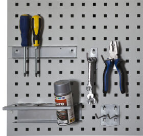 Držiaky sú vyrobené z oceľového plechu a guľatiny priemer 5 mm. Povrchová úprava je prevedená železitým fosfátom a práškovým epoxypolyesterem v odtieni matný chróm. Montáž na perfopanel - nasunutím zhora do výsekov, zabezpečenie plastovou poistkouSada obsahuje: Háčik jednoduchý 90°, L=50 mm, Háčik dvojitý 45°, L=50 mm, Držiak skrutkovačov, Držiak sprejov 3 x pr. 60 mm, Háčik jednoduchý 45°, L=100 mm,